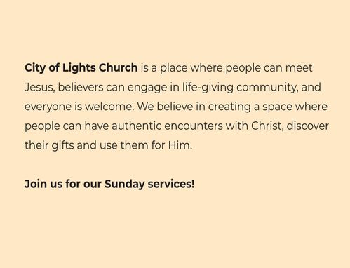City of Lights Church exists to connect a people, ignite a city, and light the world for the glory of God.